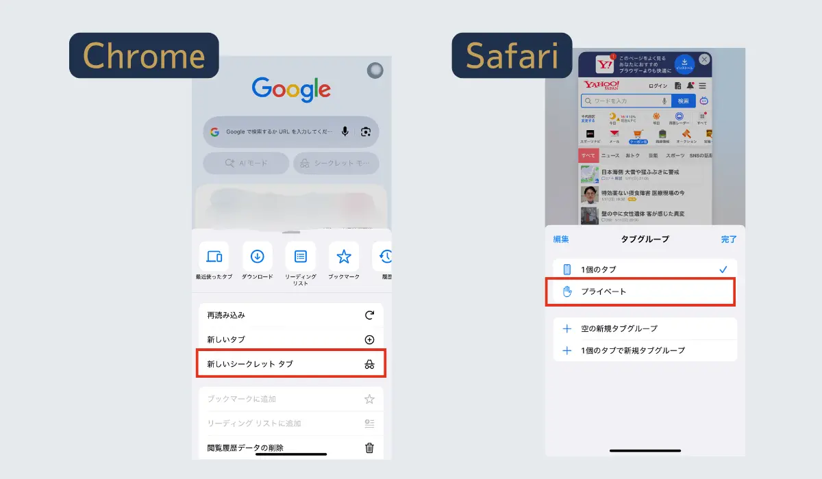 Safariは、右下の四角(□)が2つ重なったアイコンをクリック→真ん中の三本線をクリック→プライベート を選択すると、プライベードモードで開けます。